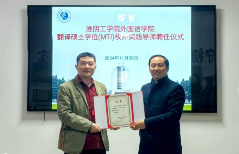 2024 年 10 月 28 日,南京瑞科翻譯公司董事長劉克超一行應邀參加了淮陰工學院外國語學院翻譯見習實踐課程結班儀式暨翻譯碩士學位 (MTI) 校外實踐導師聘任儀式。此次活動在外國語學院品學樓報告廳舉行,出席人員包括淮陰工學院外國語學院院長孫建光、副院長李梓、翻譯系副主任王春梅等領導,以及翻譯 1221、1222 班全體學生。