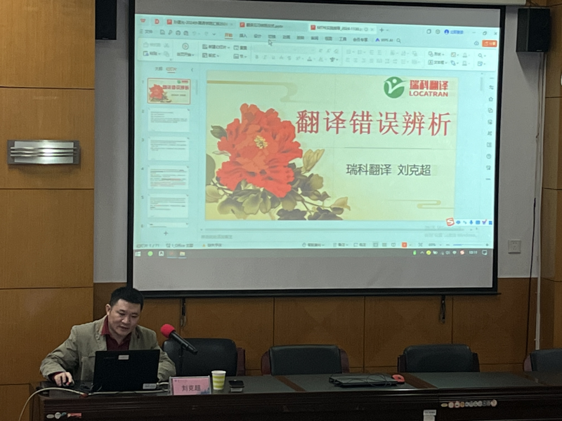 在隨后的環節中,瑞科翻譯公司董事長劉克超以“翻譯實踐與職業發展”為主題,為學生們帶來了一場精彩的專題講座。講座內容圍繞翻譯實踐中常見的錯誤展開,劉總通過大量真實的翻譯案例,詳細展示了譯員常犯的十大翻譯錯誤類型,并提出了具體的辨析和校正策略和方法。結合多年的翻譯實踐與行業管理經驗,劉總深入探討了翻譯行業所面臨的現實挑戰與未來發展趨勢,他還分享了在 AI 技術迅速發展的時代,翻譯人員如何保持核心競爭力,強調了人工審校在確保翻譯質量方面的不可替代性。