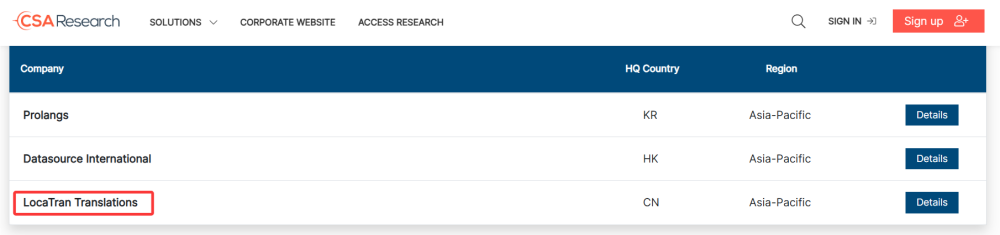 近日,國際權威研究機構 CSA Research(Common Sense Advisory Research)正式發布《2025 年全球與區域語言服務提供商榜單》,瑞科翻譯公司(LocaTran Translations)憑借在多語言服務領域的出色表現與穩健增長,再次入選“亞太地區區域市場領導者”榜單,成為中國(含中國香港和臺灣地區)入選的 18 家語言服務企業之一。該榜單基于 CSA Research 對 2024 年全球語言服務提供商經獨立核實的營收數據所作出的專業評估,充分體現了瑞科翻譯在語言服務與技術領域的專業實力與廣泛市場認可。